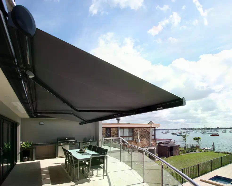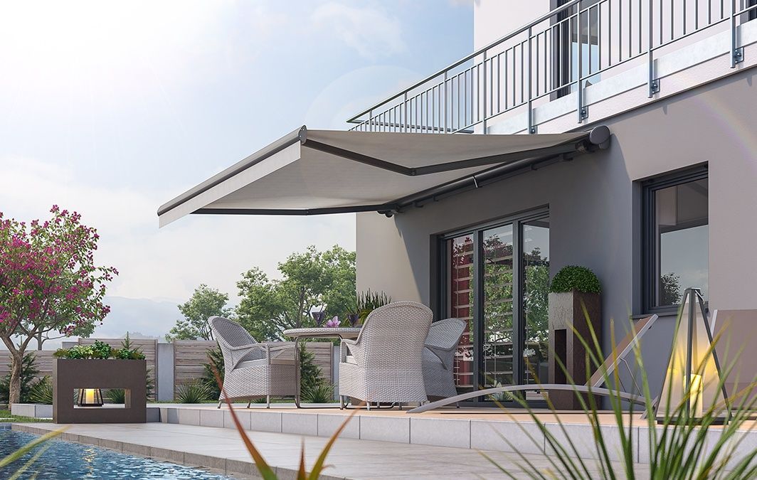Halbkassetten-Markise mit elegantem, zeitlosem Design und großem Ausfallprofil für optimalen Schutz.