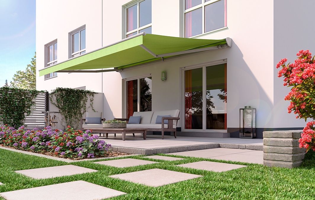 Halbkassetten-Markise mit frischem Design – zuverlässiger Schutz für Tuch und Technik.