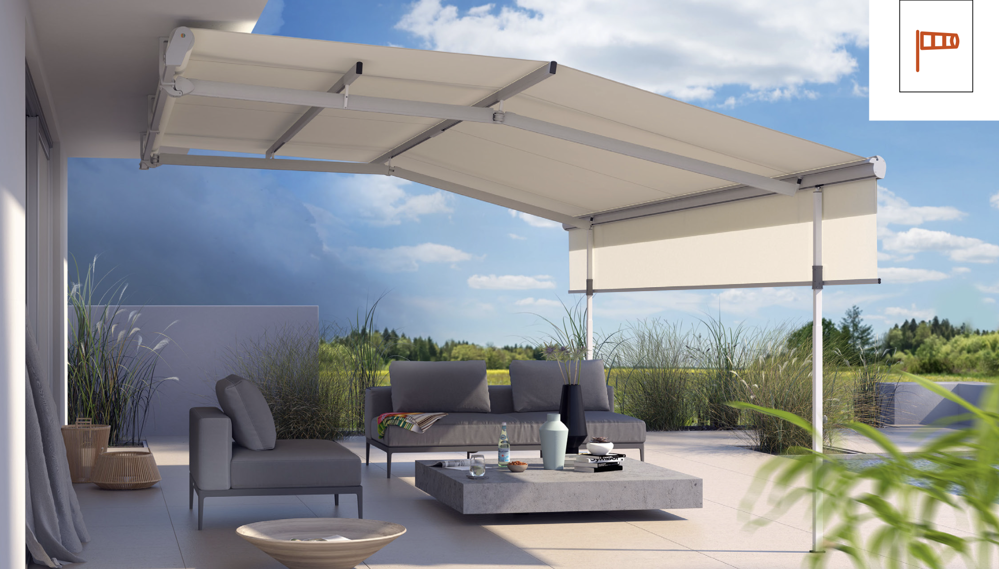 Kombination aus Plaza Viva und integrierter Senkrecht-Markise für mehr Privatsphäre und erweiterten Wetterschutz.
